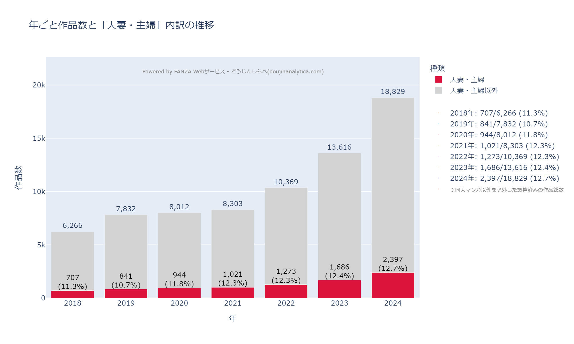 - 2024年: 総作品数 18,829件 → 人妻・主婦作品数 2,397件 (割合 12.7%) ← 最高値